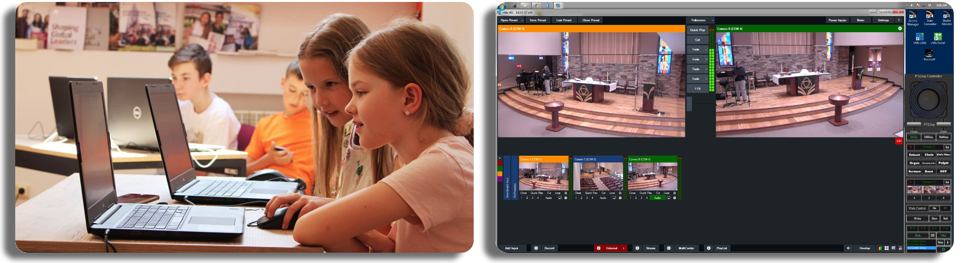 Предоставление учащимся возможности продюсировать собственное школьное шоу — отличный способ познакомить их с производством видео и телевещанием. vMix используется во многих школах, где дети ставят свои собственные шоу, которые можно смотреть на территории кампуса!
