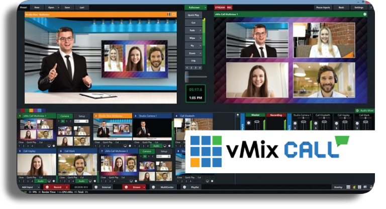 с одновременным участием до 8 гостей. Call включен в следующие версии vMix HD (1 гость) vMix 4K (4 гостя) vMix Pro (8 гостей)